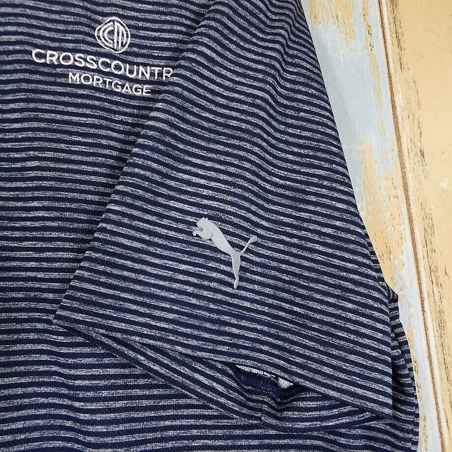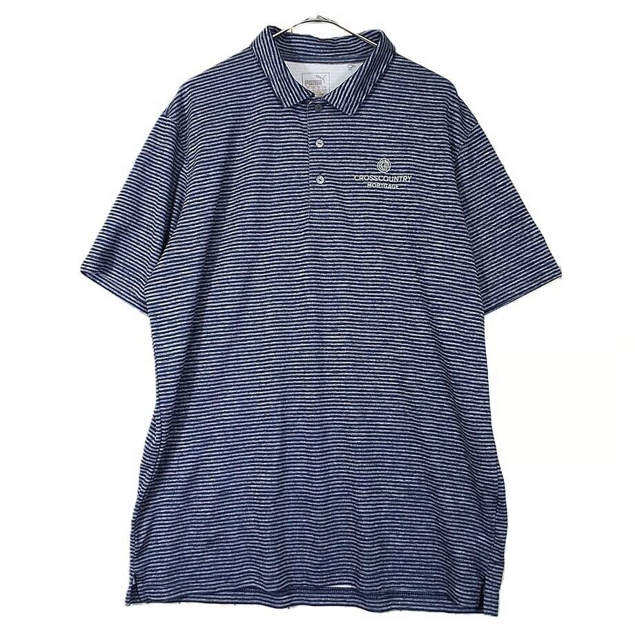 【肩幅48cm】【裏メッシュ】PUMA プーマ ストライプ柄 刺繍ロゴ 半袖ポロシャツ Lサイズ グレーネイビー【湘南倉庫】17001458 USメンズ古着 ビッグサイズ