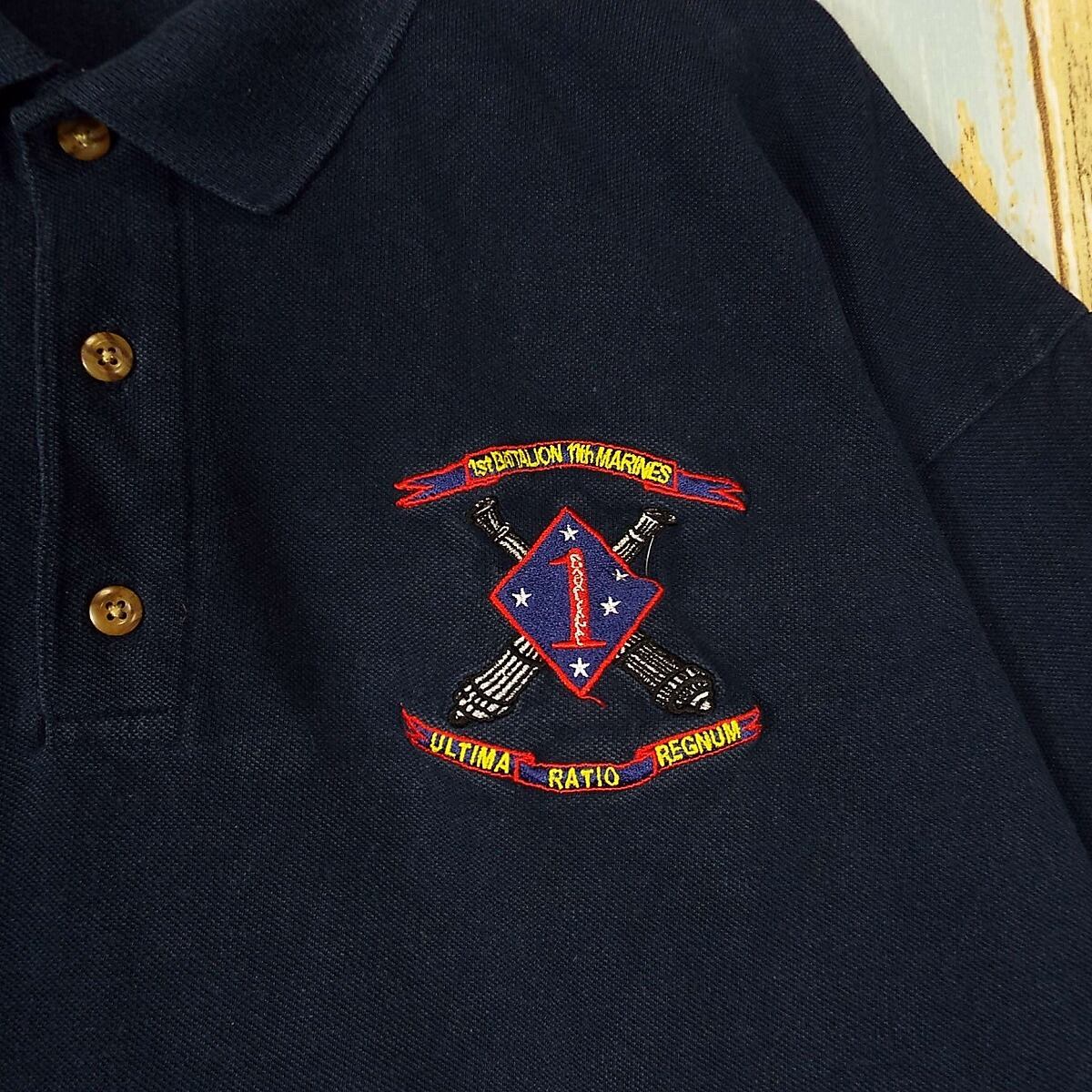 【ミリタリー海兵隊関連】GILDAN(ギルダン)1st Battalion, 11th Marines 鹿の子 胸刺繍ロゴ 無地 半袖ポロシャツ XLサイズ(肩幅 59cm)ネイビー コットン100%【湘南倉庫】USメンズ古着 17002516